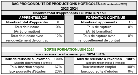 Modules spécifiques et professionnels : Diagnostics et gestion des entreprises horticoles, connaissance de l’environnement économique et politique de la production horticole, technique et conduite de production plein champ et sous abri, technologie horticole : plante, sol, climat.